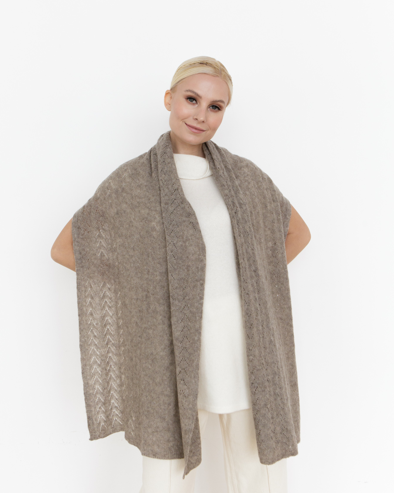 Модель выполнена в классической прямоугольной форме с аккуратной фактурной вязкой. Лаконичный дизайн делает палантин универсальным аксессуаром, который легко сочетать с пальто, кардиганами и трикотажем.