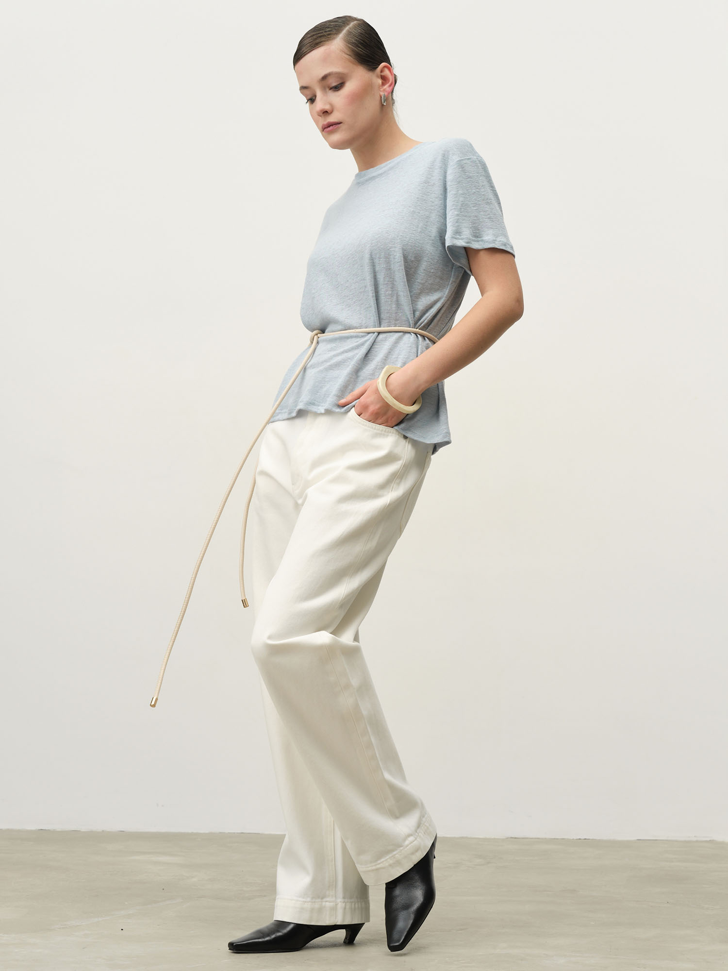 Свободный прямой силуэт с классическим круглым вырезом. Минималистичный крой делает модель универсальной и практичной.