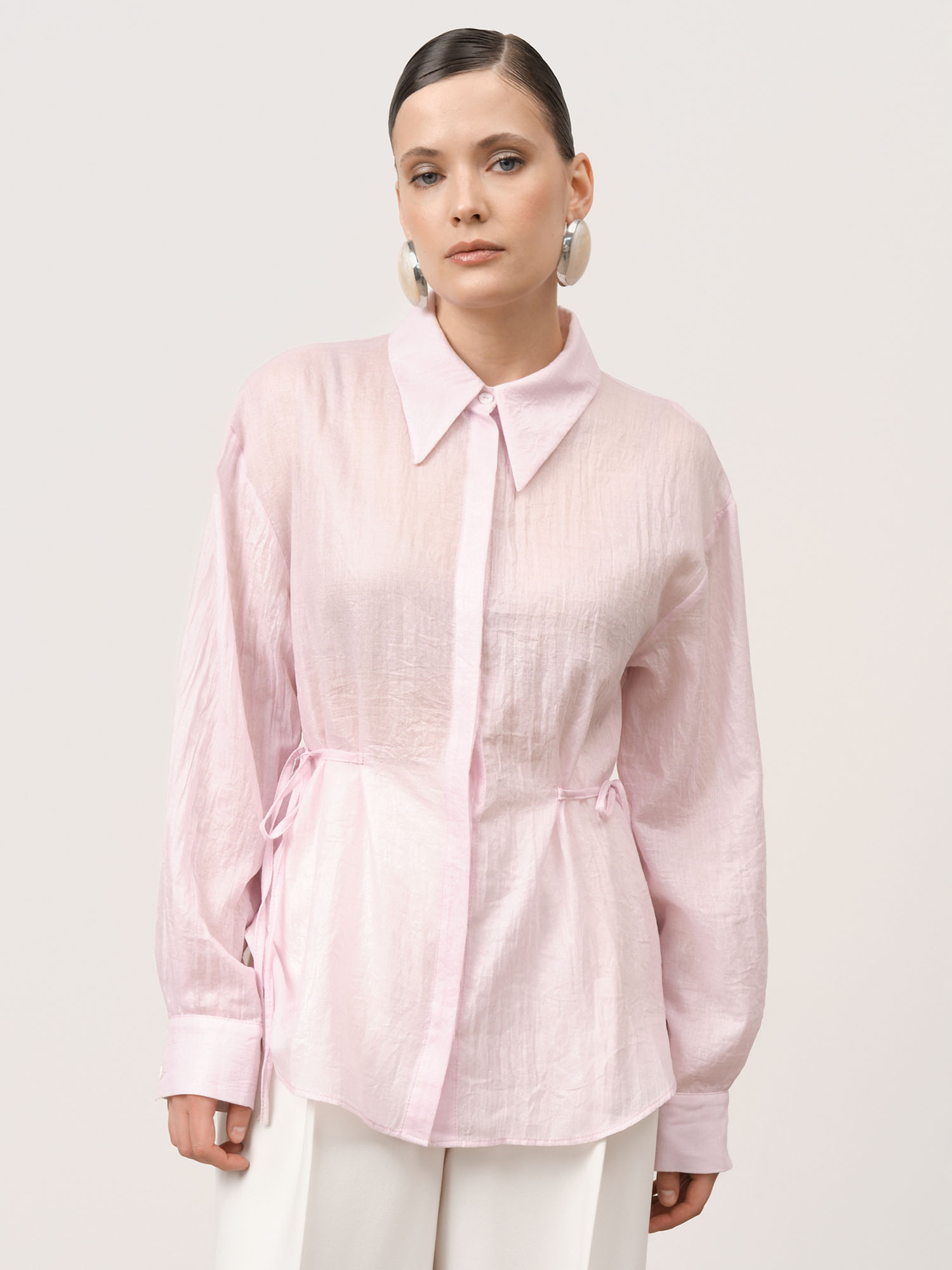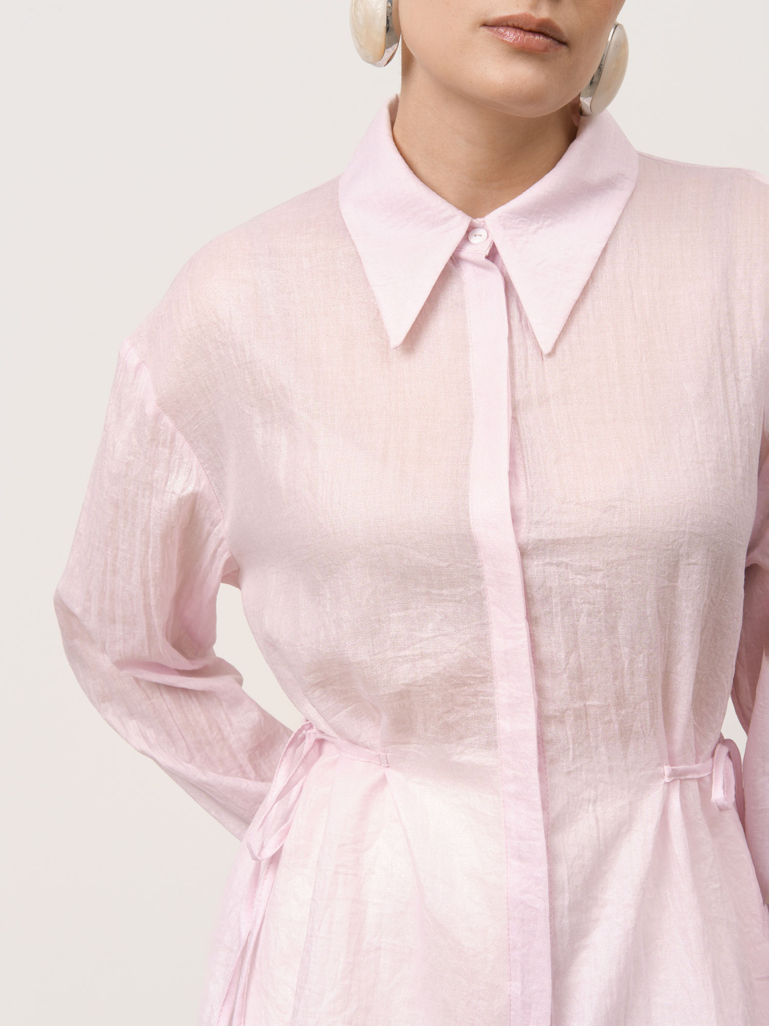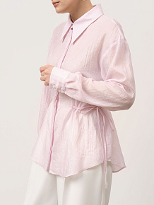 Застёжка на пуговицы, завязки по бокам для регулировки посадки, длинные рукава с манжетами, аккуратные швы, легкая фактура ткани.