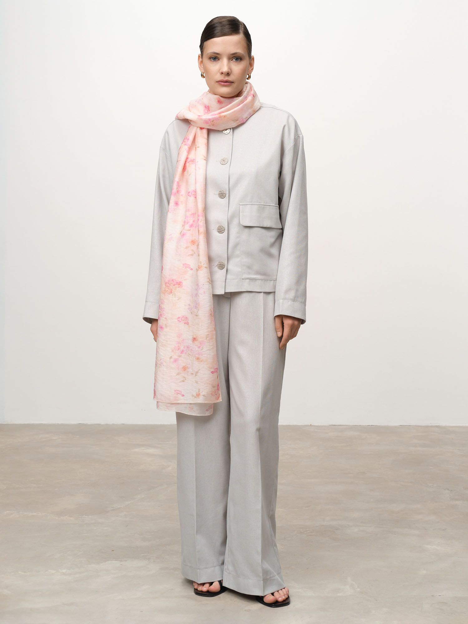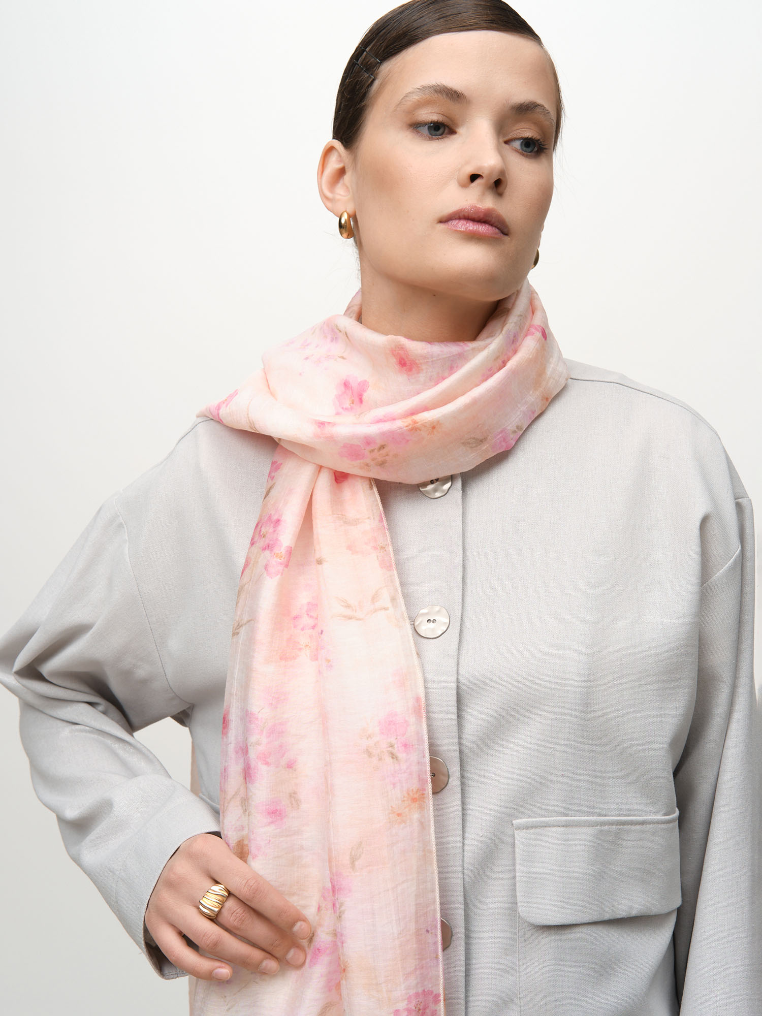 Легкий струящийся палантин увеличенного размера, с аккуратно обработанными краями и изящным цветочным рисунком. Отлично драпируется и красиво ложится в образе.
