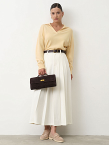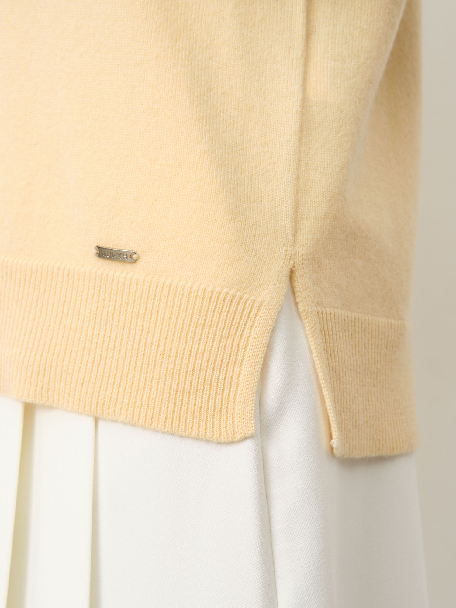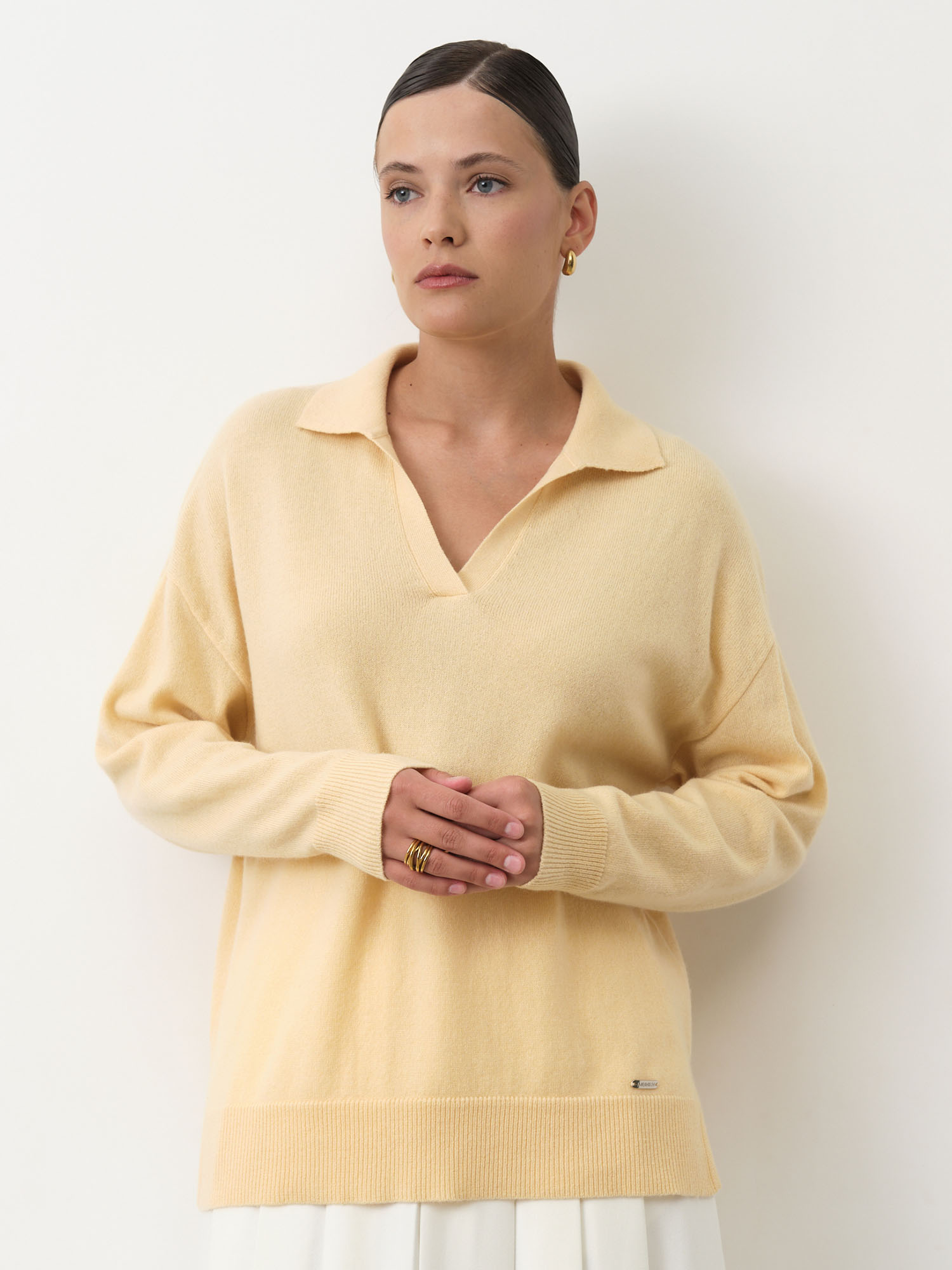 Женский джемпер из натурального кашемира в нежном оттенке шампань. Модель с мягкой посадкой и аккуратным V-образным вырезом с отложным воротником создаёт элегантный и расслабленный образ. Джемпер подходит для повседневных и более утончённых сочетаний.