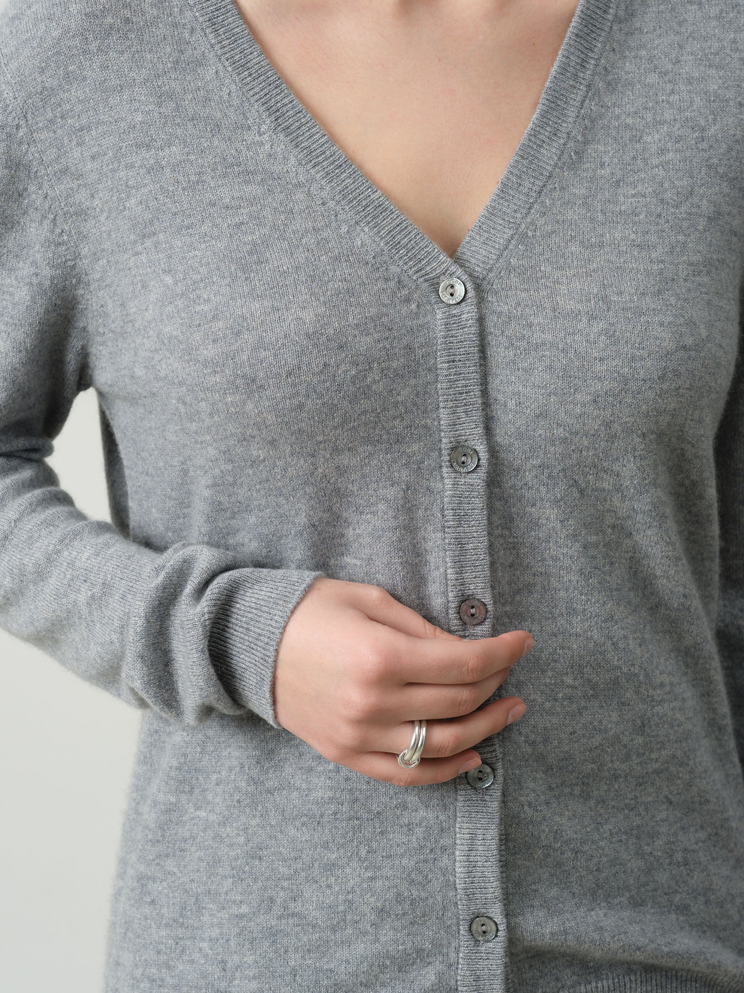 Модель выполнена с V-образным вырезом и застёжкой на пуговицы. Минималистичный крой подчёркивает универсальность изделия и делает его идеальным для многослойных образов.